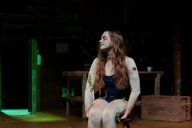 Nude bodysuit lightly dyed with teal RitDye and distressed/detailed with blue and green fabric markers, Texas Dirt and creme and powder eyeshadow (Danessa Myricks Groundwork I Palette) to match makeup design also by Siobhan McNulty